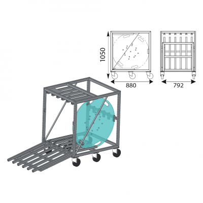 Sur 6 roulettes bleues 125mm dont 4 à frein, connu pour le transport de 6 embases EML 259, porte basculante avec blocage